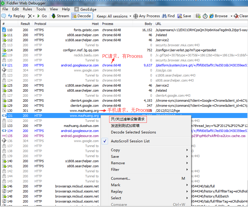 通过 FiddlerScript 扩展,在 Session 的右键弹出菜单中添加一项,作为「查看所有设备请求」和「查看单个设备请求」的切换开关。